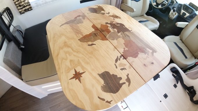 Pour la table du salon, le couple Family Découverte a travaillé avec un de leurs amis, un menuisier de l'école Boulle qui leur a réalisé des plans. La nouvelle table du Chausson est customisée avec une marqueterie en bois de la carte du monde. Plusieurs essences de bois ont été utilisées et gravées sur la table, pour un résultat final épuré et époustouflant. Vous pouvez retrouver toutes les vidéos de Family Découverte sur leur chaîne Youtube.