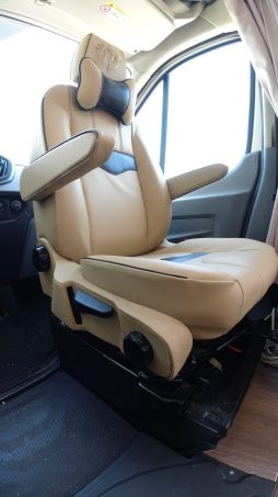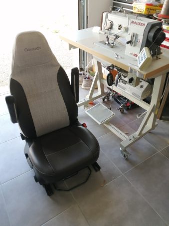 Le travail sur les sièges a été minutieux. Ils se sont d'abord penchés sur la densité de mousse, le confort, la ventilation et l'habillage afin d'adapter un siège basique en un siège en cuir VIP. Ils ont gardé une partie de la garniture mousse des sièges tout en y ajoutant du confort et de la ventilation (chaud et froid) sur l'assise et le dossier. Toute l’assise est en Bultex, une matière noble qui ne se déforme pas dans le temps, un point important à prendre en compte pour un tour du monde. De plus, tous les sièges ont été redimensionnés, des matelassures ont été rajoutées ainsi que des détails au laser.