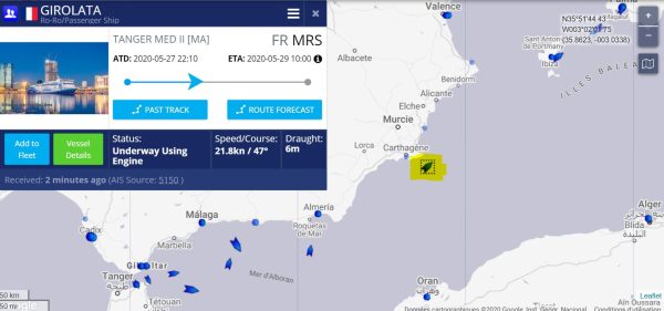 Selon Emile Verhooste, notre correspondant sur place, l'embarquement s'est passé dans de bonnes conditions et le bâtiment La Méridionale a pu reprendre la mer à l'heure prévue. Parti à 22h10, heure du Maroc, le Girolata croise actuellement au large des côtes espagnoles au niveau de Carthagène. Il doit arriver à Marseille dans le courant matinée du 29.