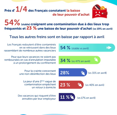 La peur de la contamination sur les lieux de vacances reste vive. Pour 59%, la prudence prévaudra lors des déplacements. Pour les hébergements, 89% des sondés souhaitent une désinfection des lieux après chaque locataire, 42% souhaitent une mise à disposition de gel hydroalcoolique sur les sites touristiques et 63% sont pour une désinfection des équipements collectifs (vélos, prêt de matériel...).
