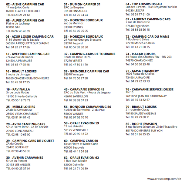Voici la liste des concessionnaires français du réseau Crosscamp :