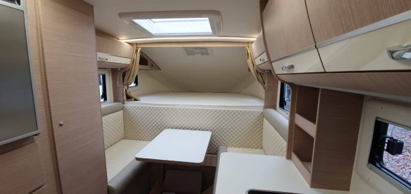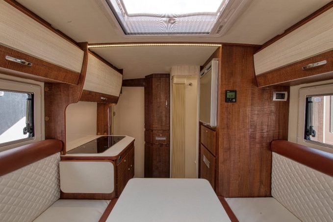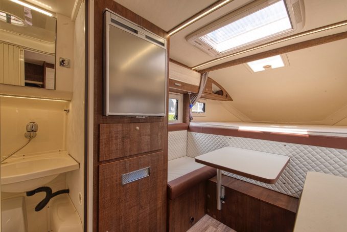 D'un point de vue design, la cellule fait preuve de sportivité avec un ligne fluide profitant d'un certain aérodynamisme. L'accès s'effectue par une porte arrière, sur la paroi latérale. A bord, l'implantation est assez commune à ce qui se pratique sur le secteur. Müller propose 3 teintes de bois au choix ainsi qu'une multitude de coloris de sellerie pour un assortiment très personnalisé.