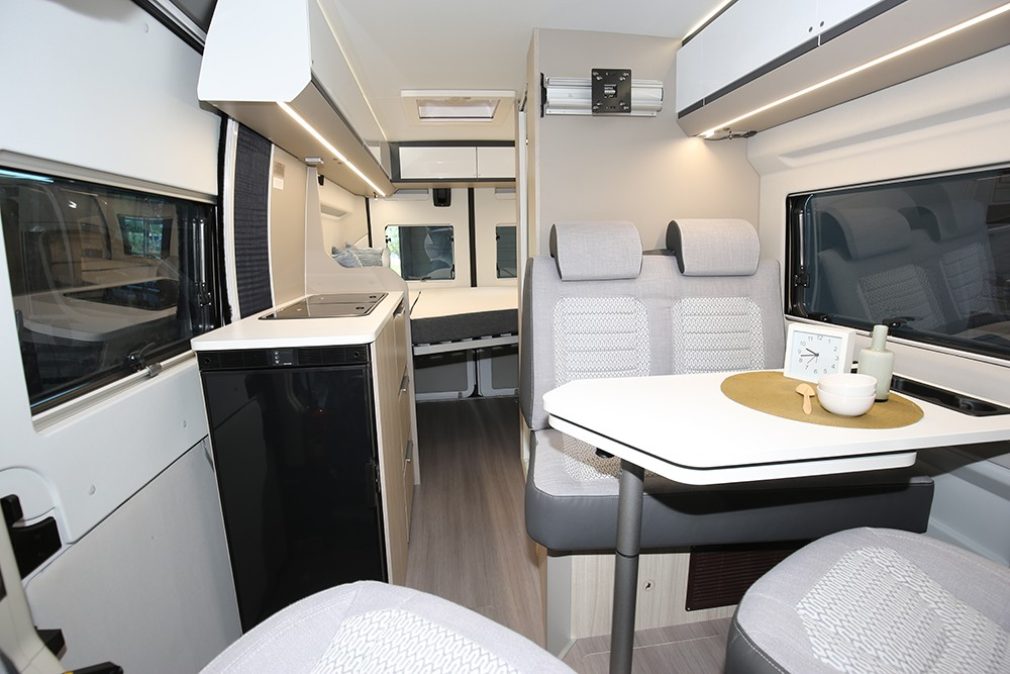 En s’attaquant au marché des fourgons, il y a quelques années, Carado n’a pas eu l’intention de révolutionner le segment. Son petit 540 adopte donc une implantation largement éprouvée avec sa dînette composée d’une banquette duo face route et table à rallonge pivotante, sa chambre où trône un lit transversal aux belles dimensions (133/130 x 195 cm) et sa salle d’eau avec ses trois portes en fixe. Mais le sérieux avec lequel la marque a abordé ses produits se ressent et la qualité est là. Et niveau tarif, difficile de trouver aussi bien pour moins cher.
