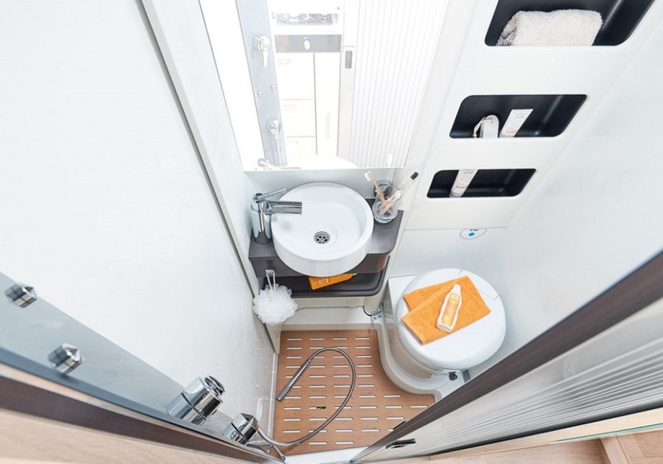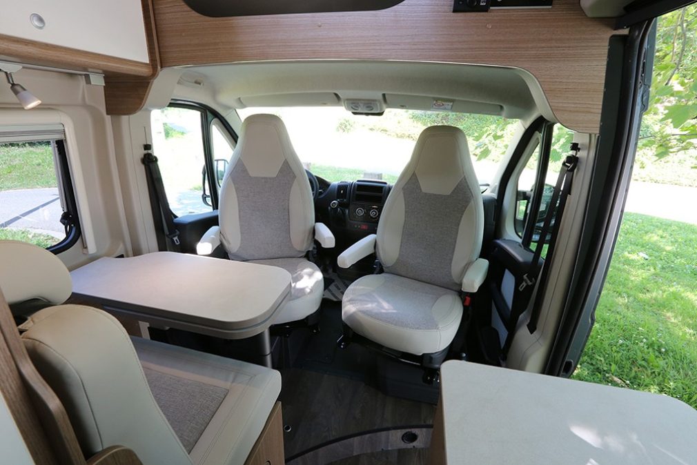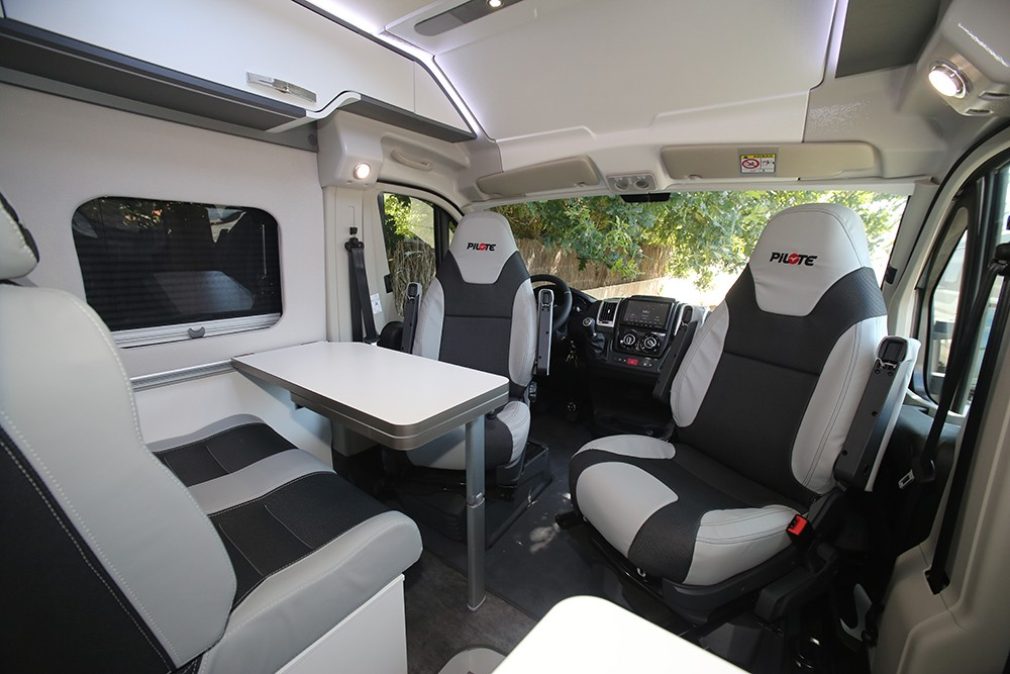 Archétype du fourgon de 5,40 m, le Pilote V540 repose sur une architecture largement rebattue : lit transversal, dînette classique avec banquette face route et salle d’eau tout-en-un. Cette dernière a abandonné, cette année, la douche centrale pour une espace regroupant les trois postes, dont une vasque rabattable permettant une certaine modularité. Pensé pour un couple, ce petit fourgon peut tout de même devenir presque familial en passant par le catalogue des options. En effet, un toit relevable permet de créer une chambre à l’étage.