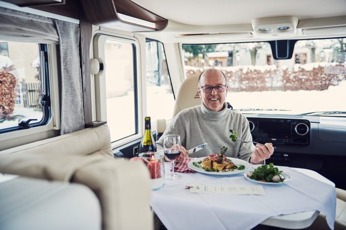 • Martin Brandt, PDG d’Erwin Hymer Group déjeunant au restaurant en camping-car. © Hymer