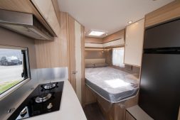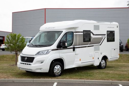 Cette implantation est l’une des plus anciennes à l’heure actuelle du catalogue Florium (et de la marque sœur Fleurette). D’une longueur ultra-compacte, ce 60 LG dispose pourtant d’une chambre relativement spacieuse dans laquelle on trouve un lit en long. L’appellation LG indique que ce couchage est positionné sur la gauche (côté conducteur). La chambre est équipée d’un bel alignement de placards de pavillon et d’une penderie au pied du lit. De quoi ranger un maximum d’affaires. Jouxtant le couchage, la salle d’eau est, elle aussi tout en long. On y découvre la douche contre le panneau arrière, le WC à cuvette pivotante au centre et enfin le lavabo proche de l’entrée. La cuisine concentre un réchaud affleurant 2 feux, l’évier en Inox et de larges et profonds tiroirs. Face à ce bloc, Florium a installé le réfrigérateur : un grand modèle à absorption et sélection automatique d’énergie de 150 l, avec compartiment freezer indépendant. Enfin le salon se destine à 4 personnes et se transforme si besoin en lit d’appoint pour une personne.