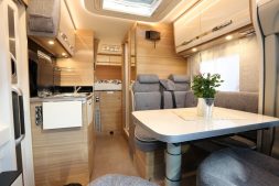 Le Globebus T1 est le plus petit véhicule de toute l’offre Dethleffs tant en longueur (5,99 m) qu’en largeur (2,19 m). Ce profilé est aussi parmi les plus anciens de la catégorie des compacts. Dethleffs ayant été précurseur dans cette famille de véhicule. Pour la petite histoire, le Globebus T1 fut dessiné par les lecteurs de CCMag avant que Dethelffs ne le réalise il y a une bonne dizaine d’années. Le Globebus T1 offre une habitabilité assez étonnante grâce notamment à une hauteur intérieure de près de 2 m. L’association du sky roof et du lanterneau panoramique apporte une belle luminosité à bord profitable au salon. L’ambiance est flatteuse et prendre place sur la confortable banquette en L du coin repas constitue un agréable moment. La cuisine se montre très fonctionnelle. On apprécie la présence du grand frigo de 142 l. La salle d’eau est équipée d’une paroi mobile sur laquelle repose le lavabo surmonté d’un miroir. Cette paroi pivote pour transformer le cabinet de toilette en cabine de douche. En partie arrière, le lit transversal de 145 x 200 cm est hélas !, un peu difficile d’accès (le couloir est étroit). Mais une fois allongé, on vantera la qualité du couchage, lequel repose sur une belle soute garage. Pour personnaliser le véhicule, Dethleffs propose en option des variantes d’ambiances, avec les versions White et Silver Edition.