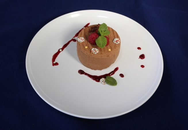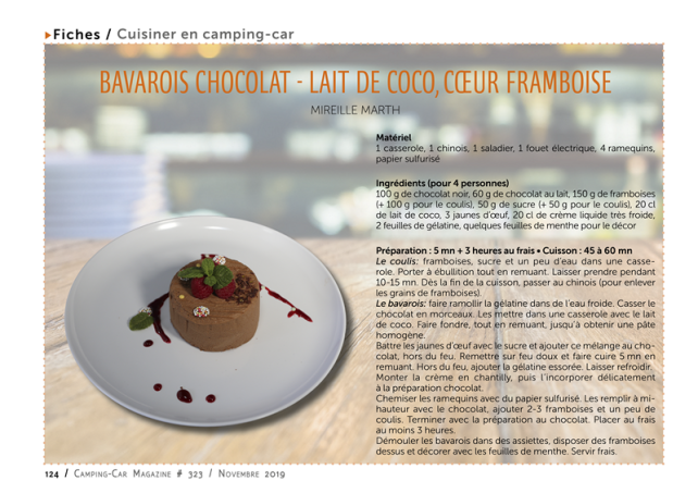 Ingrédients (pour 4 personnes) : 100 g de chocolat noir, 60 g de chocolat au lait, 150 g de framboises (+ 100 g pour le coulis), 50 g de sucre (+ 50 g pour le coulis), 20 cl de lait de coco, 3 jaunes d’œuf, 20 cl de crème liquide très froide, 2 feuilles de gélatine, quelques feuilles de menthe pour le décor
