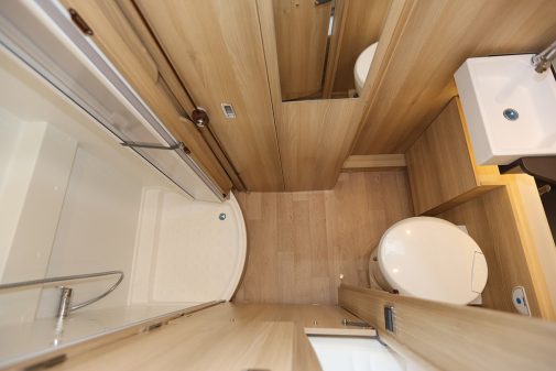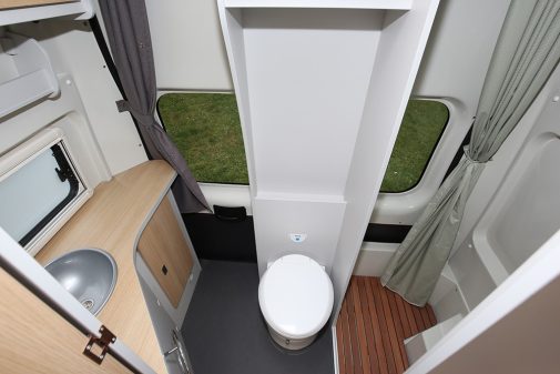 Cette formule « tout en un » se rapproche un peu plus du confort d’une cellule puisque, dans une même pièce cloisonnée, nous trouvons les trois postes habituels d’une salle d’eau. C’est la solution la plus répandue, mais la place y est parfois comptée. Dans les petits véhicules, des subterfuges permettent d’optimiser l’espace : vasque coulissante ou rabattable, bloc WC coulissant sous le lit arrière… Il existe plusieurs solutions permettant, lorsque la place manque, de privilégier tel ou tel poste. Il va sans dire que vérifier la facilité d’utilisation ou de manipulation est à tester avant l’achat.