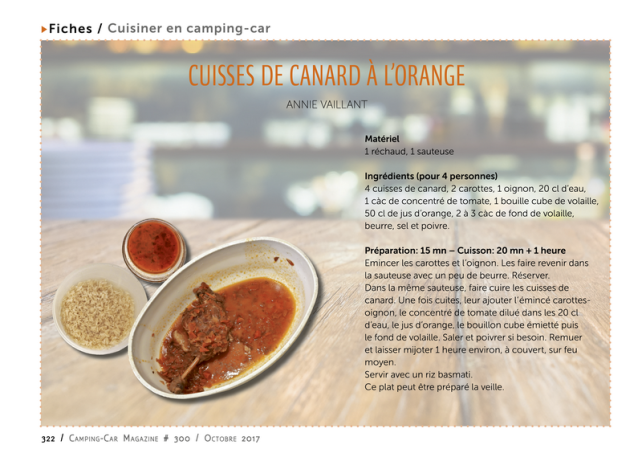 Camping-Car Magazine publie ses "Fiches Cuisiner en camping-car" depuis 2017. Voici une idée de plat proposée par une autre participante au concours cuisine de la Fête Européenne du Camping-Car, édition 2016. Fiche à découper dans notre numéro 300.
