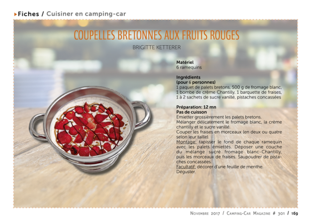 Les "Fiches Cuisiner en camping-car" sont publiées depuis bientôt 4 ans. Voici l'un des desserts proposés au concours de cuisine de la Fête Européenne du Camping-Car 2016. Fiche à découper dans notre numéro 301.