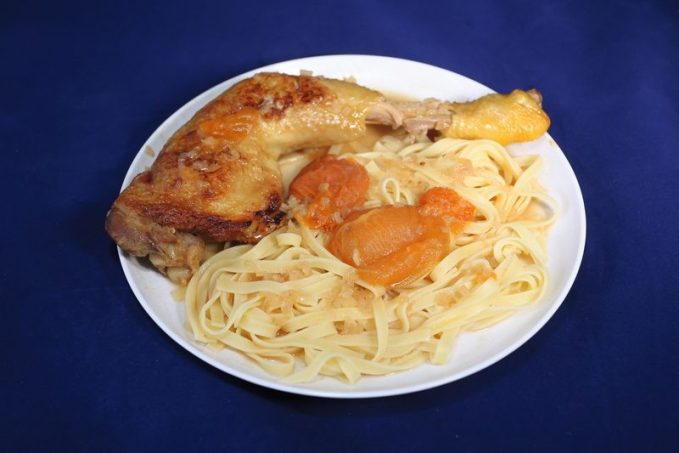 2 cuisses de poulet fermier, 1/2 boîte d’abricots au sirop, 1/2 sachet de soupe à l’oignon déshydratée, 1 càs d’huile d’olive, 1 noisette de beurre, tagliatelles fraîches