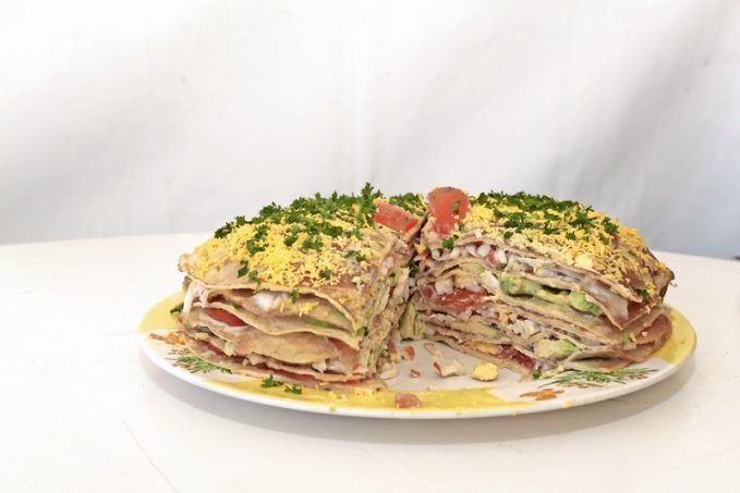 Montage : une crêpe, une fine couche de mayonnaise, des rondelles de tomate, des tranches d’œuf dur ; une crêpe, une fine couche de mayonnaise, des tranches d’avocat ; une crêpe, une fine couche de mayonnaise, des miettes de surimi. Recommencer l’opération sur deux “étages”. Terminer par une crêpe saupoudrée avec l’œuf dur râpé et le persil haché.