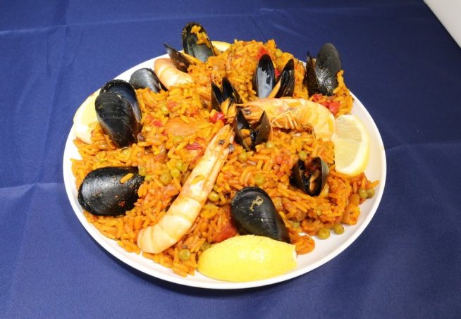 600 g de riz, 6 cuisses de poulet, 6 morceaux de râble de lapin, 12 crevettes (taille moyenne), 1 l de moules, 2 oignons, 2 gousses d’ail, 12 rondelles de chorizo, 4 càs de petits pois (surgelés), 1 petite boîte de tomate concassée, garniture à paella (sachet surgelé avec anneaux de calmars, poivron rouge, poivron vert), épices à paella, 2 à 3 citrons 6 càs d’huile d’olive, sel, poivre