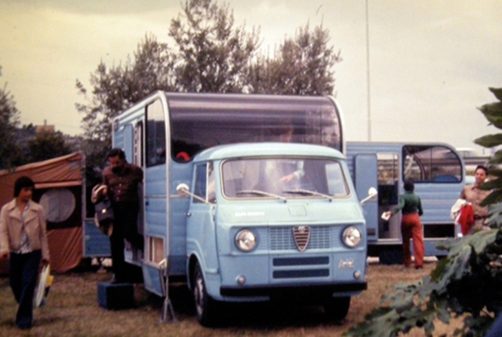 Face au succès rencontré par ses caravanes, Laverda a également conçu des camping-cars dès la fin des années 70. Le premier modèle visible ci-dessous s’appelle le A 410. La cellule était bridée sur un châssis cabine Alfa Romeo. À l époque, la construction était révolutionnaire puisque la partie avant de la cellule était habillée d’une immense baie vitrée qui n’a rien à envier au sky view que l’on trouve sur les camping-cars actuels.