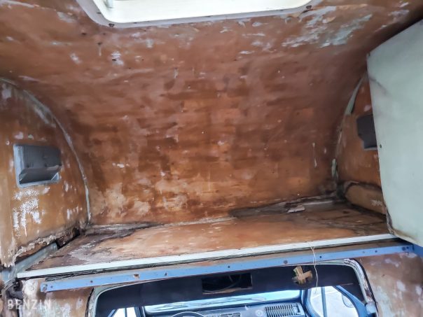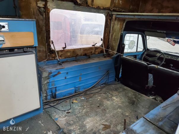 On ne peut pas en dire autant de l’intérieur de la cellule et du poste de conduite complètement délabrés, comme vous pouvez le voir sur les photos. Plus qu’un coup de neuf, l’habitacle réclame une restauration totale. Les photos publiées par Benzin montrent le misérable état intérieur. Il faudra être un bricoleur de génie pour redonner toute sa vitalité à ce petit camping-car.