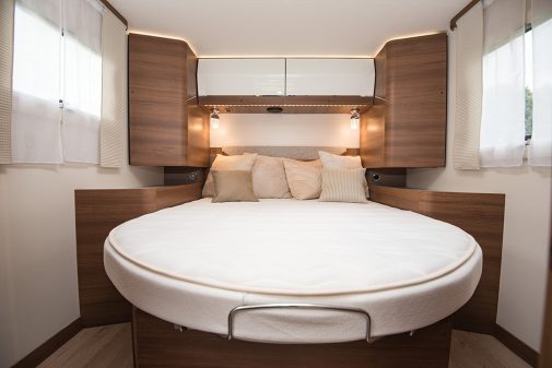 Basé sur le même plan et les mêmes caractéristiques techniques que le Carado ci-dessus, ce Sunlight V69 offre donc les mêmes prestations. Des véhicules qui prouvent l’importance pour leurs constructeurs respectifs du marché français, puisque cette implantation à lit central est typiquement pensée pour nous. Un couchage qui affiche une largeur de 140 cm pour une longueur tutoyant les 2 m. Si dînette et cuisine restent des modèles de classicisme (banquette face route, réchaud deux feux…), la salle d’eau profite d’une cloison à double face (vasque d’un côté, douche de l’autre) montée sur charnières et modulant l’espace à l’envi.