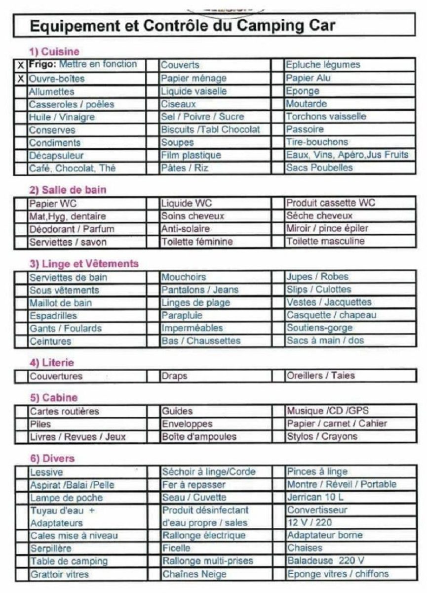 Pour Pierre, « ça dépend de la destination, bien sûr la base (tout ce qui reste en permanence dans le CC : vaisselle, épices, objets d’hygiène et de loisirs....table et chaises longues....etc.) et selon le cas, le porte-vélo ou la remorque moto.....on remplit le frigo, et hop, c’est parti ! ». Zaza elle, résume ses besoins en « 3 choses principales : le tuyau pour l’eau, les cales et une bouteille de gaz. Et là vous avez tous ce qu'il vous faut ! ». Trois accessoires également pour notre chroniqueur Matthieu Constanzo : « L'essentiel : un tuyau d'arrosage pour remplir le réservoir d'eau (avec les adaptateurs), le liquide pour les toilettes chimiques et la carte bancaire ». Enfin, Yves a carrément partagé sa checklist que nous vous relayons ici !