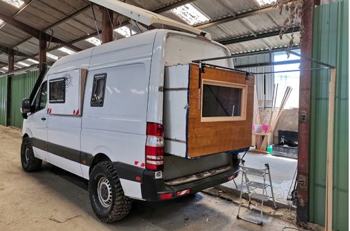 Dans sa phase 3, suite à un passage sur la balance, pour vérifier que le PTAC de 3 500 kg n’était pas dépassé, Bumblebee a été mis au régime. Après toutes les transformations reçues, son embonpoint dépassait les 400 kg, malgré l’absence de transmission intégrale. Pour éviter de rentrer dans la catégorie poids lourd, il a donc fallu reprendre pas mal de choses à zéro et se séparer de certains équipements de confort. Prendre une douche se fait à l’extérieur. La réfrigération des aliments est assurée par une simple glacière électrique Dometic de 58 litres. Déjà optimisée, la partie arrière n’a pas été retouchée. Seule l’extension gauche a été revue avec la pose d’une baie acrylique, histoire de faire entrer plus de lumière. Même chose, côté porte d’entrée, à droite.