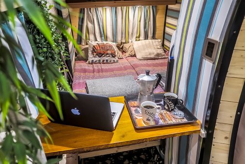 Si l’étonnant fourgon Catavantour, préparé pour de grandes aventures, attend maintenant sagement la fin de la pandémie pour reprendre les routes du monde, il continue d’être choyé au niveau de sa décoration intérieure, plutôt colorée et chaleureuse, avec un habillage complet en bois et de ses rangements (malle extérieure fixée sur le même type de support que la roue de secours).