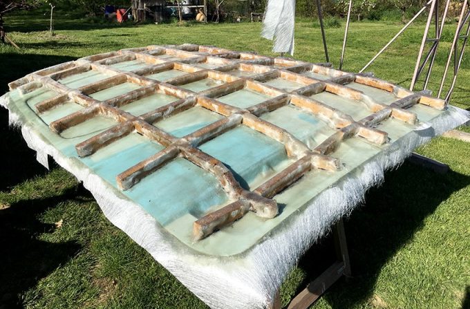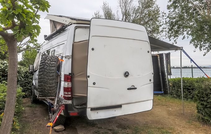 Dans sa phase 1, le projet Catavantour a d‘abord privilégié un espace nuit plus grand à l’arrière pour pouvoir disposer d’un couchage biplace repliable (type BZ) avec un sommier de 140 cm de large. La partie arrière a été fabriquée sur mesure en polyester, pour remplacer les deux portes battantes en acier. Elle reprend leur look pour conserver un joli design et assurer une meilleure étanchéité, une fois refermée. Pour étendre la partie centrale, côté flanc gauche, Cyril a dû confectionner une structure adéquate. Cette extension a nécessité une découpe assez large de la carrosserie, équivalente à une moitié de porte coulissante dans sa partie haute. Ce panneau se montre un peu plus vertical que le reste du véhicule, mais n’entrave pas trop l’aérodynamisme.