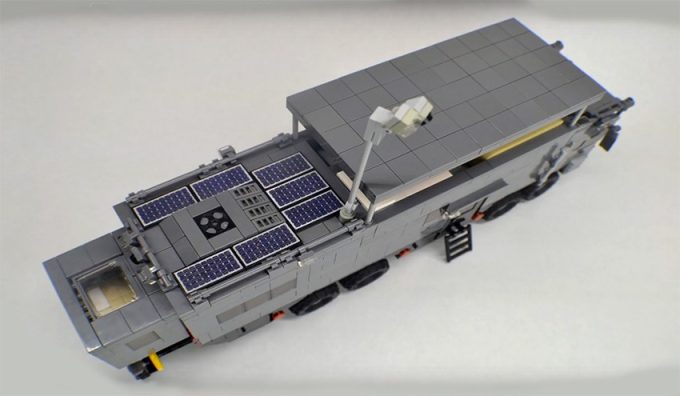 En prenant le temps de le détailler, son réalisme se révèle assez bluffant... à part sa roue de secours fixée sur le toit de la cabine. Cela commence par une ligne générale plutôt bien reproduite par un fan des petites briques danoises. Entre la cabine avec ses divers éclairages d'appoint, son arceau de protection, son pare-buffle, son treuil intégré, une antenne satellite, sans oublier une climatisation sur le toit, sept panneaux solaires, plus différentes échelles d'accès à la cellule ainsi qu'un slide-out et un porte-moto, en partie postérieure, ce MOC (My Own Construction ou création personnelle en Lego) ne manque pas d'allure, posé sur son châssis à huit roues. Cette maquette affiche pas moins de 50 cm de long pour 20 cm de haut.