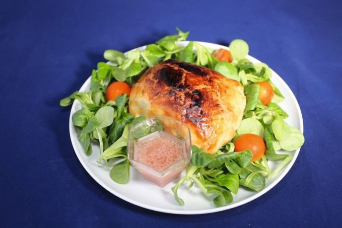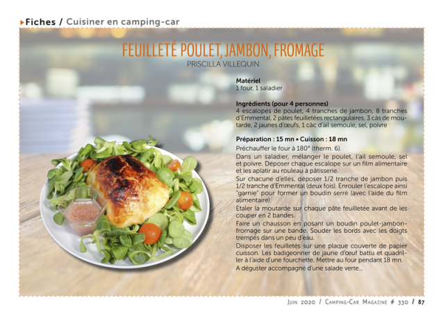 4 escalopes de poulet, 4 tranches de jambon, 8 tranches d’Emmental, 2 pâtes feuilletées rectangulaires, 3 càs de moutarde, 2 jaunes d’œufs, 1 càc d’ail semoule, sel, poivre