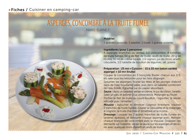 Camping-Car Magazine publie ses "Fiches Cuisiner en camping-car". Au concours de cuisine de la 20e Fête Européenne du Camping-Car, une entrée fraîcheur a été présentée au jury. Retrouvez la fiche recette dans notre numéro 330.