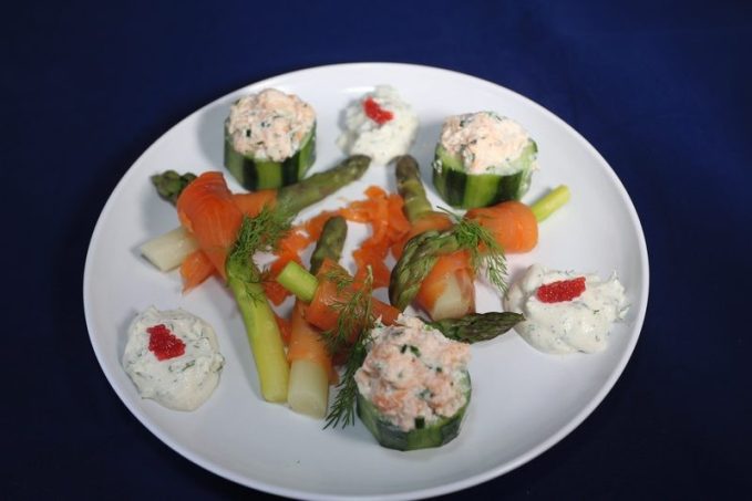 Dressage : couper les 2 autres tranches de truite fumée en lanières épaisses, et entourer chaque asperge avec. Remplir chaque tronçon de concombre avec la mousse. Disposer ces éléments sur l’assiette, verser la sauce sur les asperges et décorer avec quelques brins d’aneth et œufs de truite.