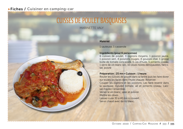 Camping-Car Magazine publie ses "Fiches Cuisiner en camping-car". Voici un plat comme on les aime. Nous l'avons dégusté lors du concours de cuisine de la Fête Européenne du Camping-Car 2019. Fiche à découper dans notre numéro 333.