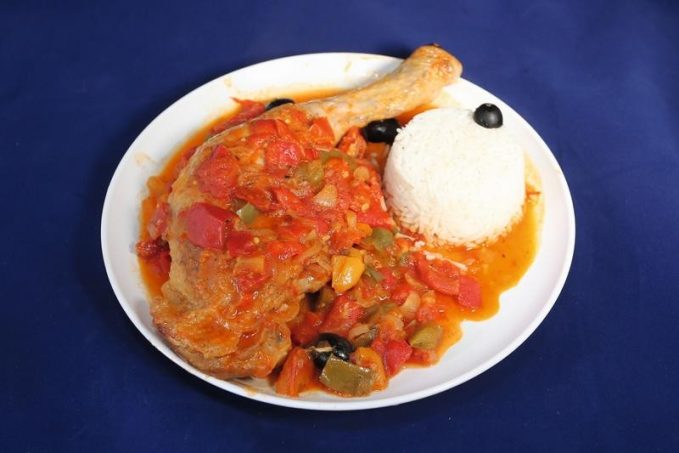 6 cuisses de poulet, 3 oignons moyens, 1 poivron jaune, 1 poivron vert, 4 poivrons rouges, 4 gousses d’ail, 1 grosse boîte de tomate concassée, 6 càs d’huile, 5 piments oiseau, 1 verre de vin blanc sec, 10 olives noires dénoyautées, farine, sel, poivre