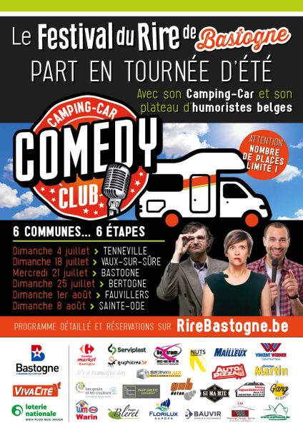 Le Camping-car Comedy Club démarrera sa tournée le 4 juillet et ce, pendant 5 dimanches (et un mercredi). Le prix du billet s’élève à 25 € et les réservations se font uniquement par mail auprès de info@rirebastogne.be Retrouvez toutes les informations sur le site Internet du Festival du rire de Bastogne.