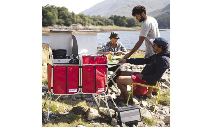 - Le pack Kinoo, destiné à cuisiner, se compose d’un bloc avec réchaud, évier et réserve d’eau propre de 20 litres (avec pompe électrique), plus un réservoir de 20 litres pour récupérer les eaux usées.