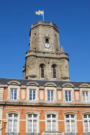 Ce beffroi est un ancien donjon seigneurial (deux premiers niveaux), partiellement détruit en 1268, mais rapidement reconstruit avec un troisième niveau qui abrite les cloches et la tourelle. Sa flèche disparaît au cours d’un incendie (1712). Elle est remplacée par un étage octogonal qui “élève” l’édifice à 35m de haut.