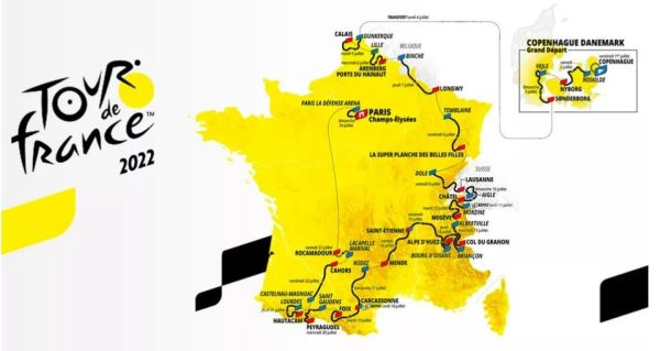Le tracé de La Grande Boucle aura lieu du 1er au 24 juillet 2022. Le départ est prévu à Copenhague, au Danemark, 3 étapes scandinaves sont annoncées au début de cette édition. Après un transfert, la poursuite du Tour se fera sur les chapeaux de roues sur les pavés du Nord. Arrivée prévue, comme à son habitude, sur les Champs-Elysées le 24 juillet 2022.