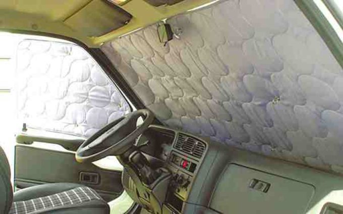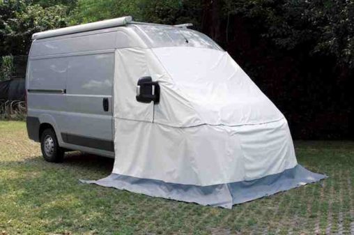 Le fabricant italien Fiamma va encore plus loin avec le Thermoglas XXL. Cette protection est composée de deux parties. Au niveau supérieur, elle couvre le pare-brise, les vitres latérales et les bouches d’aération. Au niveau inférieur, elle enveloppe entièrement le compartiment moteur. Les deux s’associent à l’aide de scratchs. Leur combinaison évite la circulation de filets d’air froid provenant de la cabine. Comptez à partir de 299 €