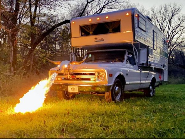 Tout cela n’est pourtant pas que du cinéma. Ce camping-car tout droit venu de l’enfer existe bien. Il a même été vendu récemment aux enchères sur le site Bring a Trailer. Son propriétaire l’avait acheté dans un triste état en 1989. Entièrement restauré, ce pick-up géant a reçu une cellule amovible transformant l’ensemble en un admirable motor-home. Mais pour pousser encore plus loin l’exubérance, comme savent si bien le faire les Américains, le propriétaire de cet énorme engin l’a pourvu d’un lance-flammes crachant le feu par le museau du crâne d’une d’antilope d’Amérique. Tel un dragon, cette tête d’animal propulse ses flammes alimentées en propane, quelques mètres devant le véhicule, tout en opinant du chef. Pourquoi une telle installation ? Nul ne le sait. Une hypothèse, c’est que le propriétaire n’avait pas assez de place à bord du véhicule pour y charger un barbecue ? Le lance-flammes fait alors office de remplaçant pour griller un T-bone.
