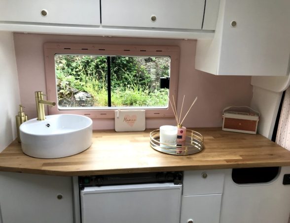 Ma coiffeuse exerce dans un camion aménagé. Je trouvais l’idée originale et finalement cela me correspondait. J’ai racheté un vieux camping-car qui a 23 ans aujourd’hui. Avec l’aide de mon mari et de mon père, j’ai refait les peintures extérieures, intérieures. Globalement j’ai tout de même gardé la structure intérieure de la cuisine en ajoutant une vasque et j’ai enlevé les banquettes pour les transformer en bureau pivotant.
