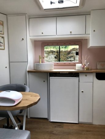 C’est vrai que ce concept attire beaucoup l’œil. Une fois installée, mes clientes oublient qu’elles se trouvent dans un camping-car. Car finalement, il ressemble beaucoup à un véritable salon !