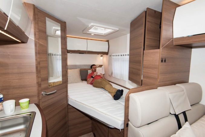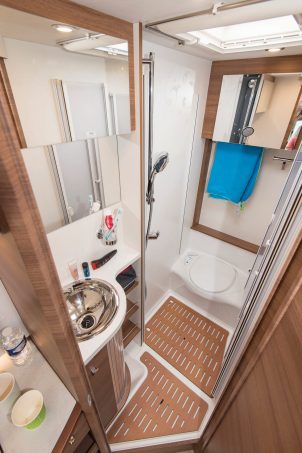 L’espace nuit reçoit un lit à la française de 204 x 133 cm. La largeur est étroite, mais constante grâce à une extension, au pied. Celle-ci, une fois repliée, libère le couloir pour accéder plus facilement à la salle d’eau. Cette dernière est occupée par un WC banquette contre le panneau arrière, une cabine de douche centrale isolée par des panneaux en Plexiglas et un lavabo. Ce poste est mieux maîtrisé que celui du fourgon V62.