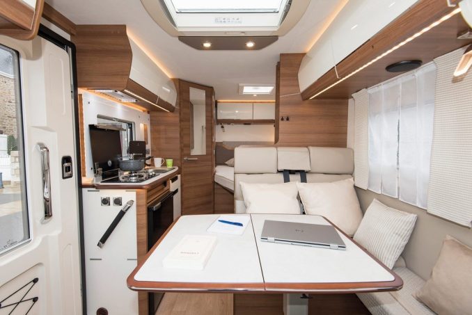 Grâce à son mini-gabarit, le profilé Rapido C56 affiche une silhouette fine. Ce modèle est long de seulement 5,99 m, large de 2,12 m et 2,75 m de haut. Qui dit mieux ? Nous sommes face aux mêmes dimensions que celles d’un fourgon ! L’intérieur en reprend aussi les codes. La cuisine, par exemple, a été installée à gauche de la porte d’entrée. Le salon se compose d’une banquette face route, avec un retour escamotable, des sièges de cabine sur embase pivotante et d’une table dont le plateau, sur pied central télescopique, est rabattable de moitié. Ce pied autorise d'ailleurs la transformation facile de la dînette en couchage d’appoint. Il faut toutefois s’armer d’un peu de patience pour comprendre le schéma d’installation. Sur le fourgon, la conversion du salon en lit est plus simple…