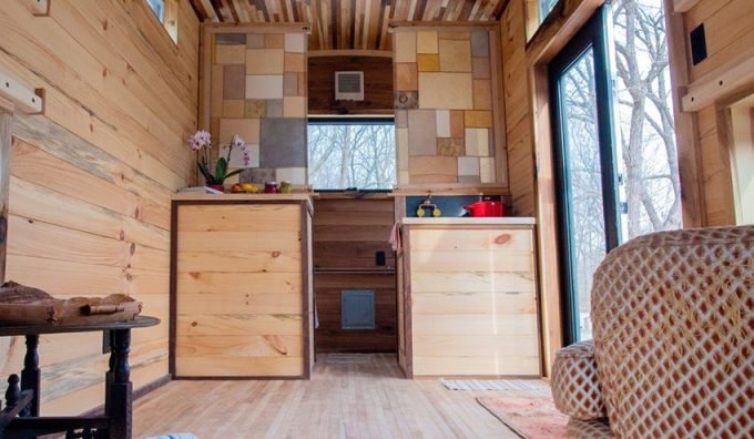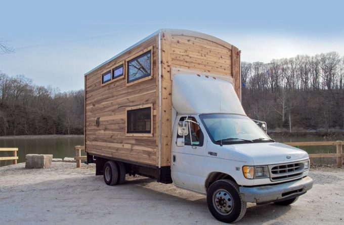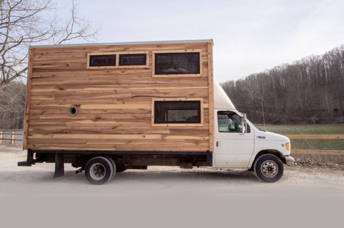 Utilisé dans sa première vie comme camion de transport de marchandises, le truck Ford a délaissé sa caisse arrière pour une structure en bois. L'opération a été menée, dans l’Indiana, par l’entreprise Carpenter Owl spécialisée dans l'élaboration de "maisons de poche". Un plancher a tout d'abord été boulonné sur le châssis. Puis une structure métallique, associée à des planches de bois, a servi à monter les murs et le plafond. L'ensemble a été isolé avec de la laine de mouton. La surface extérieure utilise un système d’écran pare-pluie fait de cèdre et de peuplier. Le toit, joliment voûté, a recours à des chevrons protégés par de la tôle galvanisée habillée par dessous d’une toile en caoutchouc.