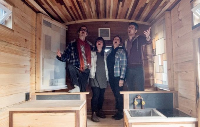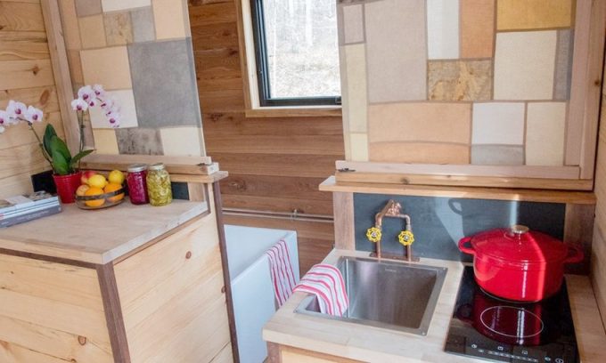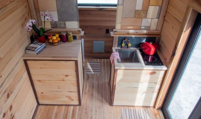 L’intérieur n'est pas en reste en matière d'originalité et de matériaux écologiques. Il fleure bon le pin blanc, l'orme, l'érable, le cèdre, le peuplier ou encore le noyer. Si cette "Tiny House" ne se révèle pas immense, elle est tout de même plus vaste qu'une cellule de camping-car. Derrière la cabine du poste de conduite prend place une pièce à vivre avec assises et table basse. Une cuisine avec plaque radiante à deux feux, évier, meuble de rangements et réfrigérateur sont aussi présents. Comble du luxe, la salle de bain porte pour une fois bien son nom. Elle s'équipe d'une véritable baignoire ainsi que de toilettes sèches. Et pour dormir ? Il faut passer à l'étage. En mezzanine, comme suspendu dans les airs, un couchage pour deux personnes surplombe la pièce de vie... sans véritable barrière de sécurité. L'amour du risque et de l'originalité a désormais un prix.