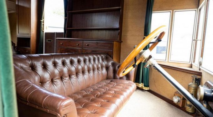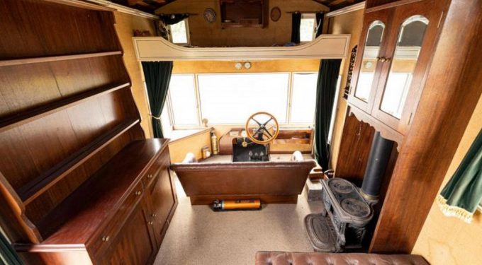 A bord, on y trouve un beau canapé en cuir, un système de chauffage issu d’un poêle à bois et bien d’autres curiosités.