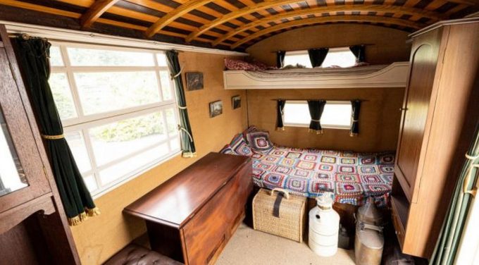 Pour la petite histoire de ce camping-car vintage, ce dernier a été préparé par la société Dunton of Reading, spécialiste de l’aménagement des caravanes à l’époque. Ce véhicule aurait été vendu au cours des années 1920 et ensuite laissé à l’abandon avant d’être restauré dans les années 70 par un ébéniste.