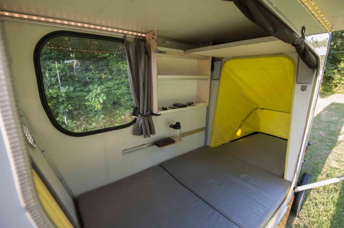 Cette société vient en effet de sortir de ses chaînes d’assemblage une version camping-car de son quadricycle. Il s’agit en vérité d’une cellule amovible qui prend place sur la ridelle du vélo. Cette cellule est aménagée pour pouvoir y vivre. On y trouve un salon transformable en couchage, une petite cuisine avec un réfrigérateur coffre. La table peut aussi être installée à l’extérieur en la fixant sur le côté de la carrosserie.