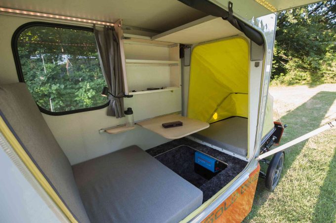 Manque seulement des toilettes et une douche. Il faudra donc prévoir au moins une douche solaire. Mais l’énergie solaire est également exploitée avec plusieurs panneaux de 400 W pour accumuler de l’énergie électrique et alimenter l’éclairage de l’habitacle ainsi que la batterie, laquelle permet d’animer le moteur d’assistance du vélo de 250 watts.
