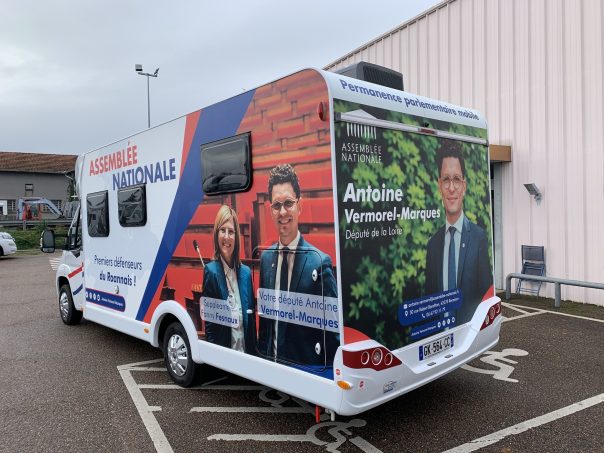 Il arrive fréquemment que les députés sillonnent les routes de leurs circonscriptions à bord d’un camping-car quand ils font campagne pour les élections législatives. Une fois élus, les parlementaires ouvrent généralement des permanences dans une des villes de leur territoire. Antoine Vermorel-Marques, député de la 5e circonscription de la Loire et sa suppléante Fanny Fesnoux ont décidé de faire autrement. Ils ont en effet loué un camping-car à un concessionnaire local (Van & Loisirs 42 du réseau Idylcar) pour le transformer en bureau mobile qui est devenu depuis quelques jours leur permanence nomade.