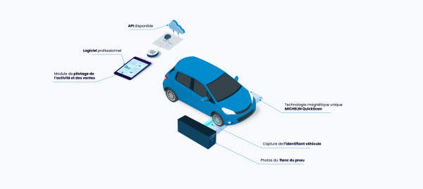 - Un système de photographie latérale des pneumatiques permet d’identifier leurs dimensions, la marque et leur type afin de prononcer un diagnostic « personnalisé » et adapté à ceux-ci.