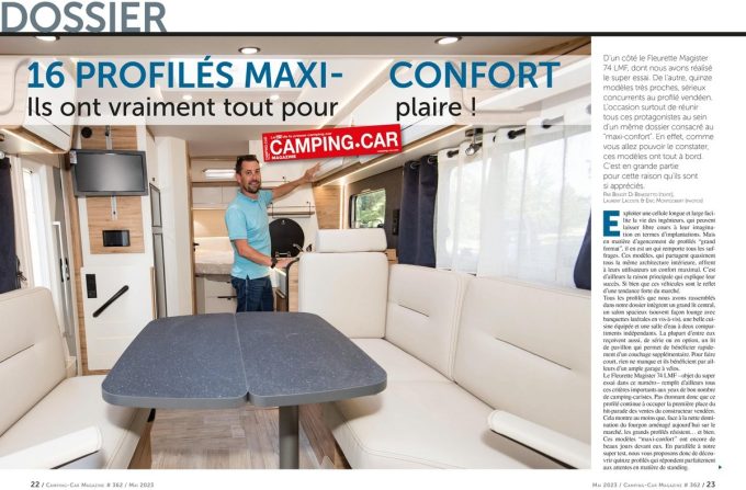En matière de camping-cars, ce mois-ci nous mettons à l’honneur 16 modèles maxi-confort dotés d’un salon face-face, d'un grand lit central, d'une salle d’eau indépendante et d'une cuisine design ! En figure de proue, le Fleurette Magister 74 LMF Edition 55 qui fait l'objet de notre super essai, et à laquelle nous lui opposons 15 concurrents. A propos des fourgons, nous avons sélectionné pour notre Journal du Van, l'ensemble de l'offre 1er prix, avec des tarifs en dessous des 53 000 €.